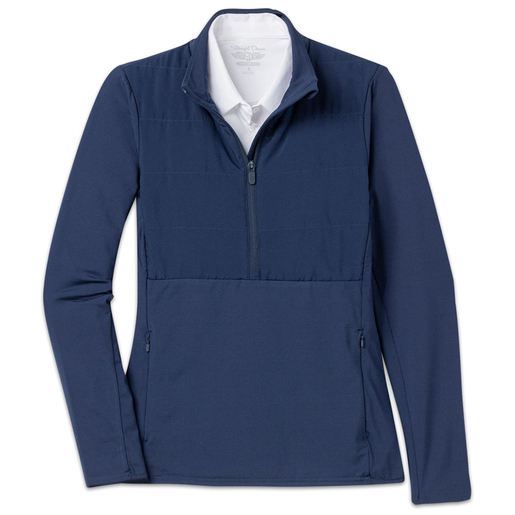 Corporate teams or branded events benefit from the Straight Down Women's New Indigo Althea Half Zip, a sleek pullover with a soft-touch finish. The ribbed cuffs and drop shoulders give it a cozy feel, while the mock collar adds structure. It's perfect for cool climates and pairs well with other custom gear.Highlights