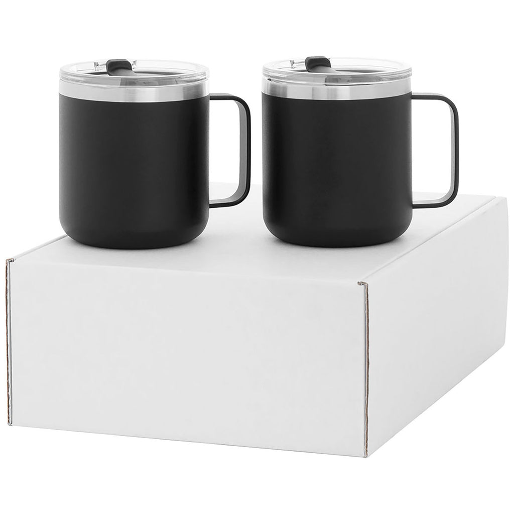 The ETS Black Campers Gift Set is a great way to show your customers, clients, or employees just how much you value them. Inside of this set's high-quality white corrugated gift box, you'll find a pair of handled travel mugs featuring your company's personalized logo or design.
