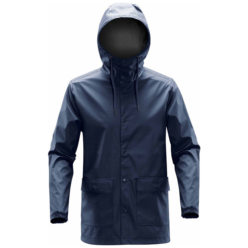 Brave the rain in comfort and style with a custom Stormtech Men's Navy Squall Rain Jacket. Add a company logo screen print to the great fitting, extra-length, fully lined waterproof raincoat. The matte finish means this is an easy choice for any environment whether being used as corporate apparel or a day out with the family. Extras include welded waterproof seams, flapped snap closure hand pockets, adjustable elasticized cuffs, and underarm and back venting for easy wear. The classic style means you will look your best, even when the weather is at its worst. Place your order today.Corresponding Women's Style: Stormtech Women's Navy Squall Rain Jacket