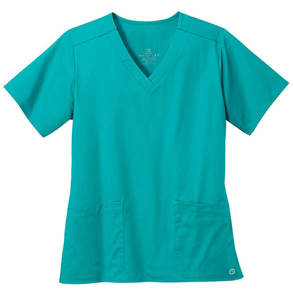 Outfitting female healthcare professionals starts with the WonderWink Women's Teal Blue WorkFlex V-Neck Top. A great place for you to add your company's custom logo, this stylish piece of apparel is made from a comfortable mechanical stretch fabric and includes awesome extras like a shoulder badge loop and dual front pockets.