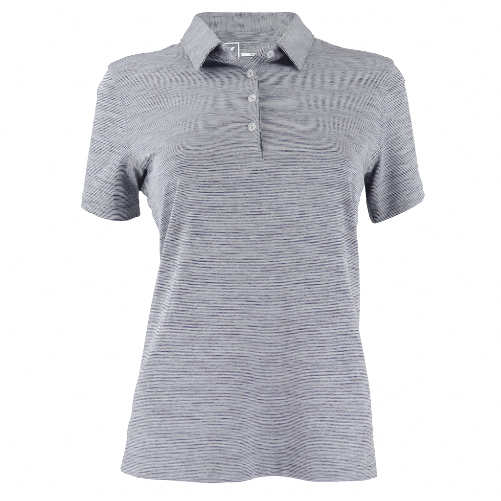 Introducing the Zusa Women's White/Steel Heather Stripe Polo, a custom polo shirt that brings the performance you're used to on the golf course to the office. These personalized polos ditch the glossy look of traditional polyester polos while holding on to the performance benefits like moisture-wicking, UV protective fabric. This fabric doesn't just perform though, it's sustainable too. In fact, each of these polos are made using 8 plastic bottles! Just add your custom embroidered company logo to make these polos the ultimate corporate apparel for women.
